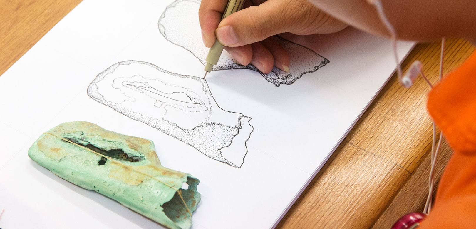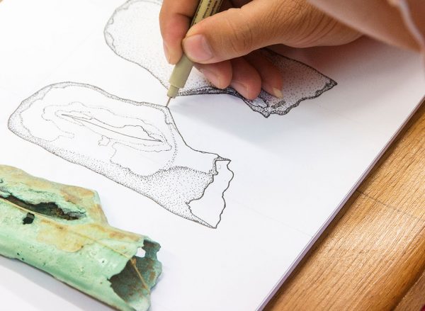 Pictured: Mr Amphai Butphachit, an archaeologist with the Lao Department of National Heritage, Ministry of Information, Culture and Tourism, is drawing the fine details of a bronze axe recovered during excavations in Vilabouly.  This artefact was used by Lao copper miners around 2000 years ago.