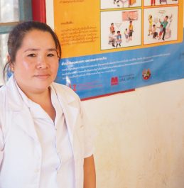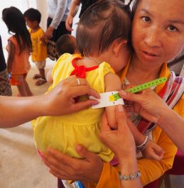 At Nam Pa village in Vilabouly district, Savannakhet province, Lao PDR, local nurse Kaidaphan is tending to mothers and their children in a busy community hall. Dozens of mothers have brought their children to her to be weighed, measured and immunised. Alongside the babies crying in the hall, three children sit patiently on a makeshift desk waiting to have the circumference of their arms measured.